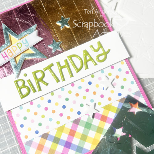 Take a medium size 3D Foam Star and place it to a piece of yellow cardstock. Apply blue foil to the star and trim the star out with scissors. Add a “happy” sticker on top of the star. Next, take a strip of white cardstock and add the word to “birthday” to it. I used stickers, but you could handwrite it or stamp it, if desired. Then adhere the sentiment strip to the card front with Crafty Power Tape Polybag 81ft.